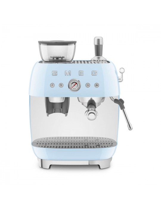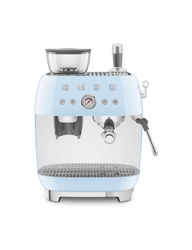 Cafetera espresso con molinillo integrado, 50- style, Azul pastel. Sistema de calentamiento Thermoblock doble, 20 bar presión. Capacidad depósito agua: 2,4L, calentador tazas. Capacidad contenedor granos café: 250 g, Molino acero inox. Nievles molido (Sup