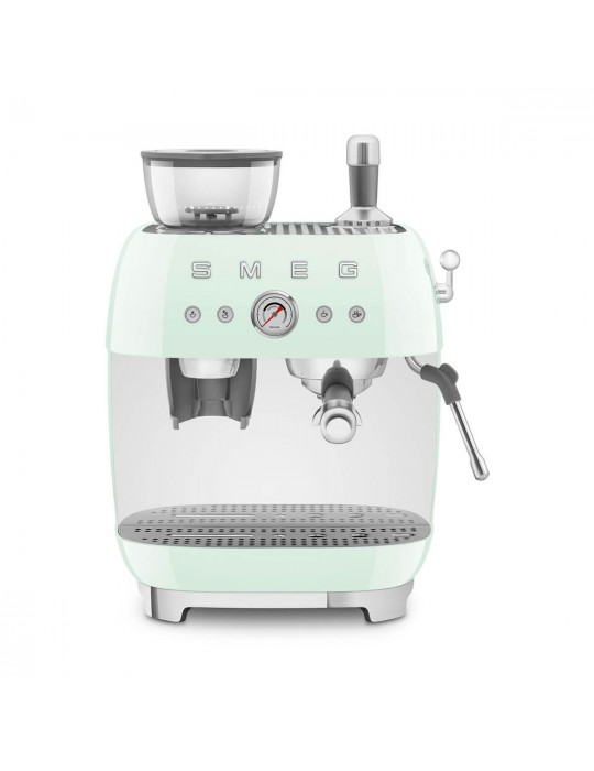 Cafetera espresso con molinillo integrado, 50- style, Verde pastel Sistema de calentamiento Thermoblock doble, 20 bar presión. Capacidad depósito agua: 2,4L, calentador tazas. Capacidad contenedor granos café: 250 g, Molino acero inox. Nievles molido (Sup