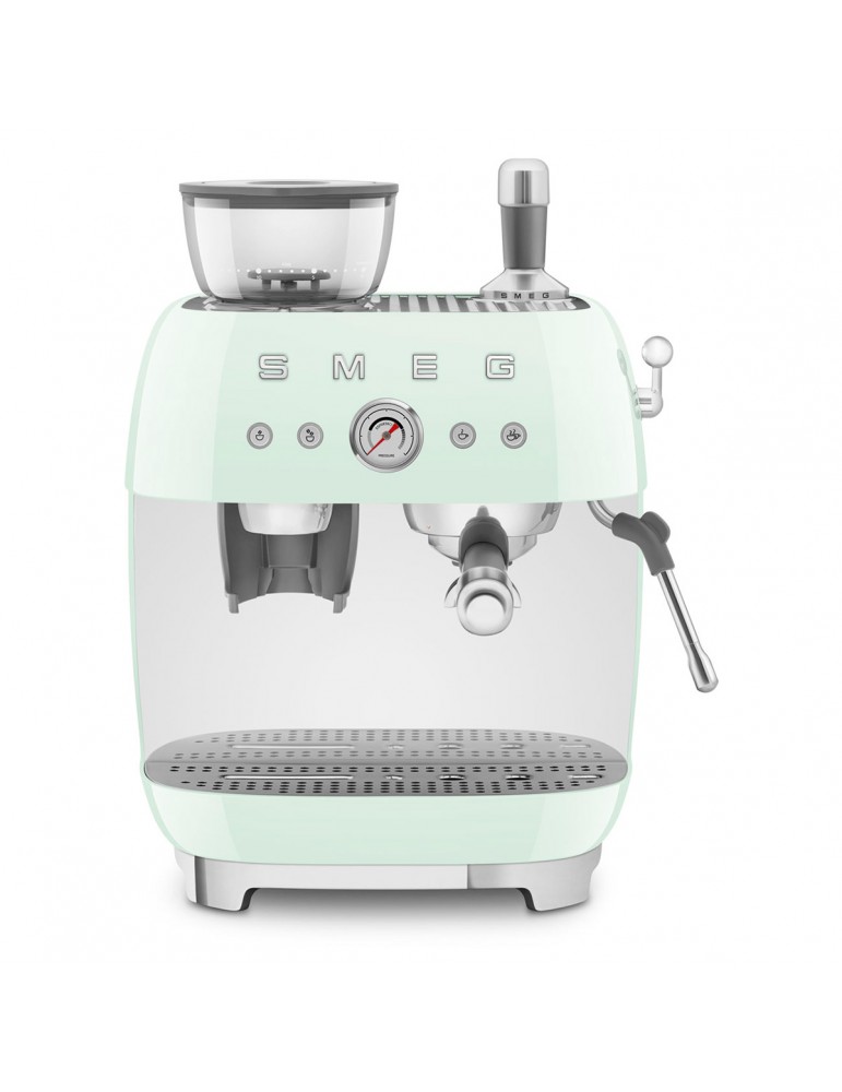 Cafetera espresso con molinillo integrado, 50- style, Verde pastel Sistema de calentamiento Thermoblock doble, 20 bar presión Capacidad depósito agua: 2,4L, calentador tazas Capacidad contenedor granos café: 250 g, Molino acero inox Nievles molido (Super
