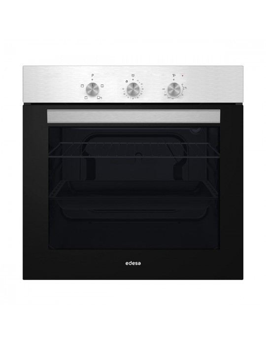 Horno convencional inox de 60cm y 66 litros de capacidad. Programador minutero/paro. 4 programas de cocinado. 2 cristales en puerta con ventilación tangencial. 2 bandejas esmaltadas profundas de 50mm. Rejilla cromada