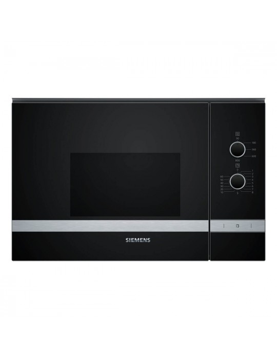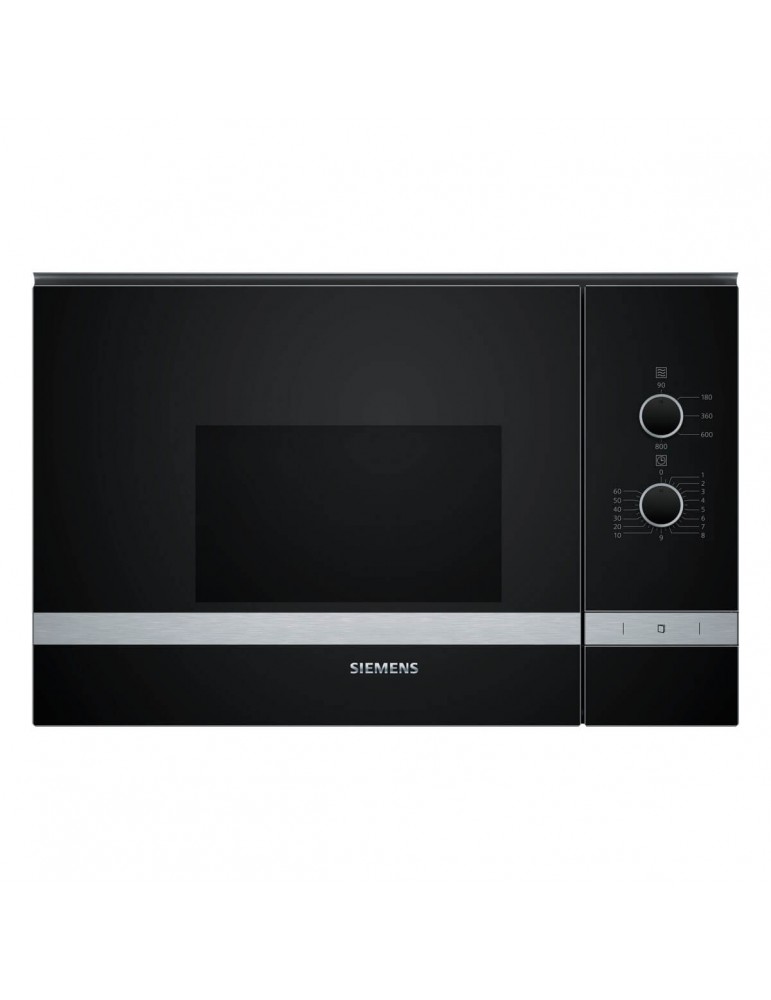 SIEMENS, BF520LMR0, Microondas, Mecánico, Encastrable con marco, 38 cm, 20 litros, 5, Ap. lateral izquierda, Cristal negro/inox, Programación mecánica de paro, Plato giratorio 25,5cm, Mandos fijos, Sin grill