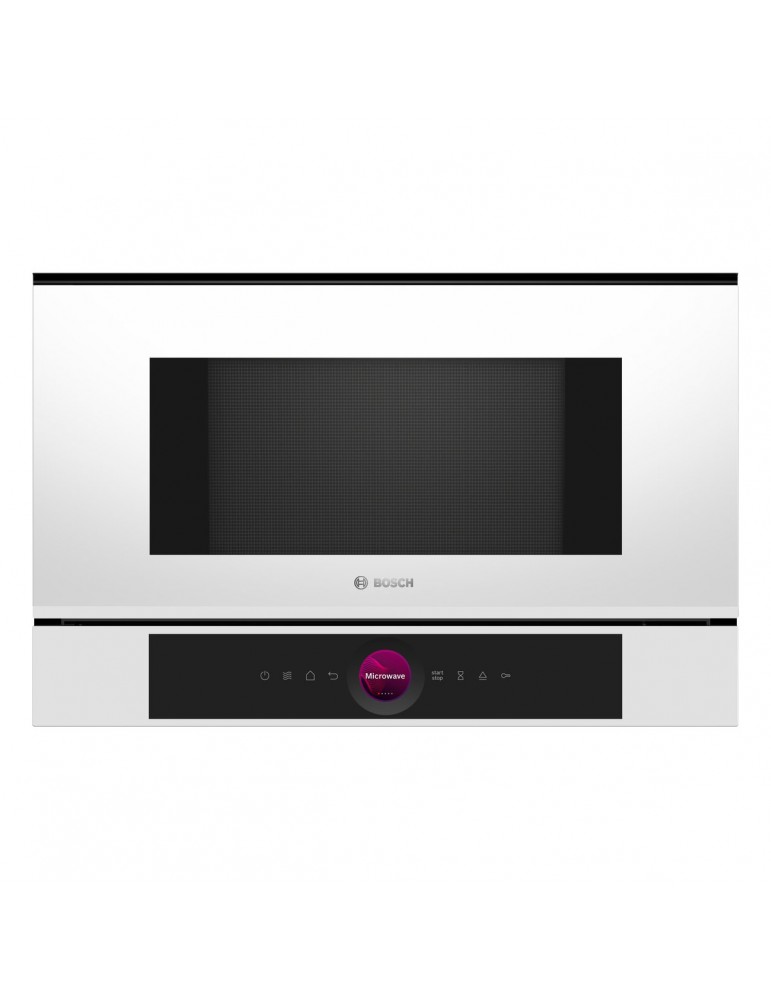 BOSCH, BFL7221W1, Microondas, electrónico, Integrable sin marco, 38 cm., 21 l., 5 F, Asistente de limpieza con agua, Ap. lateral izquierda, Cristal blanco, Display TFT touch, 7 prog. auto., Programación electrónica de paro, sin plato giratorio, sin grill.