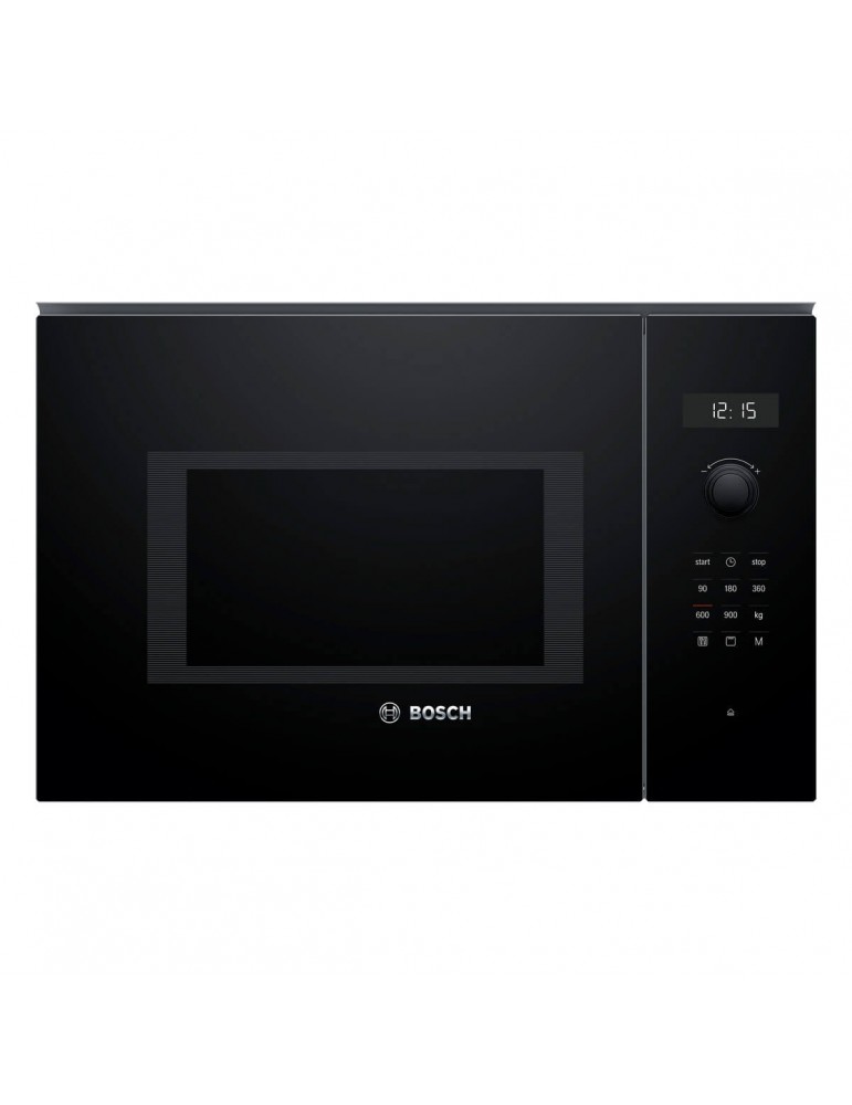 BOSCH, BEL554MB0, Microondas, electrónico, Encastrable sin marco, 38 cm, 25 litros, 5, Ap. lateral izquierda, Cristal negro, Display LED, 8 prog. auto., Programación electrónica de paro, Con plato giratorio 31,5 cm., Mando ocultable, Con grill.
