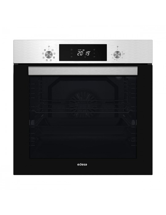 Horno multifunción plus inox de 60cm y 80 litros de capacidad. Display. 7 programas de cocinado y 1 especial. 2 cristales en puerta con ventilación tangencial. Mandos escamoteables. Guías laterales telescópicas 50% extraíbles, PSP. 2 bandejas esmaltadas p