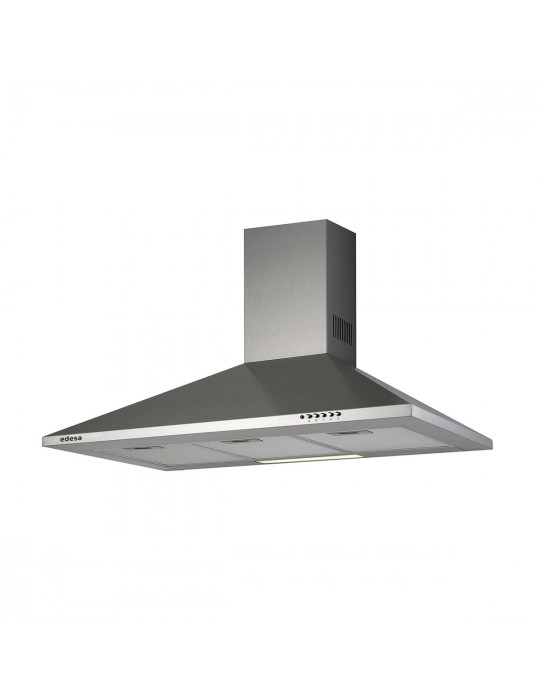 Campana decorativa piramidal de 90cm. Motor de 95W, K7PLUS. Potencia de extracción Máx/Mín:420/210m3/h. Nivel sonoro Máx/Mín:65/53 dB(A). Eficiencia energética C. 3 niveles de extracción. Mandos mecánicos. 2 lámparas de iluminación LED, e14. Filtros están