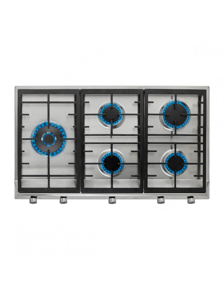 86*50, 5 fuegos, 1 doble anillo izq., mandos frontales metalizados, quemadores alta eficiencia, fundición amplia sup.butano (incluye inyectores para cambio a natural)