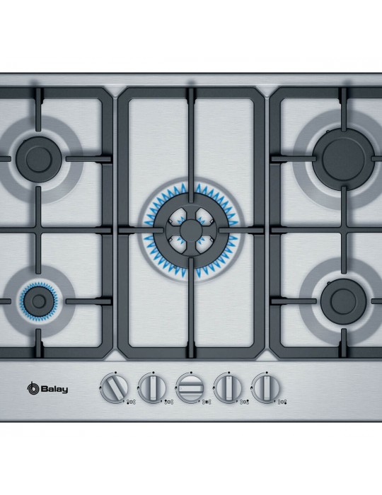 BALAY, 3ETX576HB, Encimera, Gas, Encastrable, 75 cm, 5, Acero inoxidable, Wok 3,3 kW, Gas Stop, parrillas hierro fundido, autoencendido